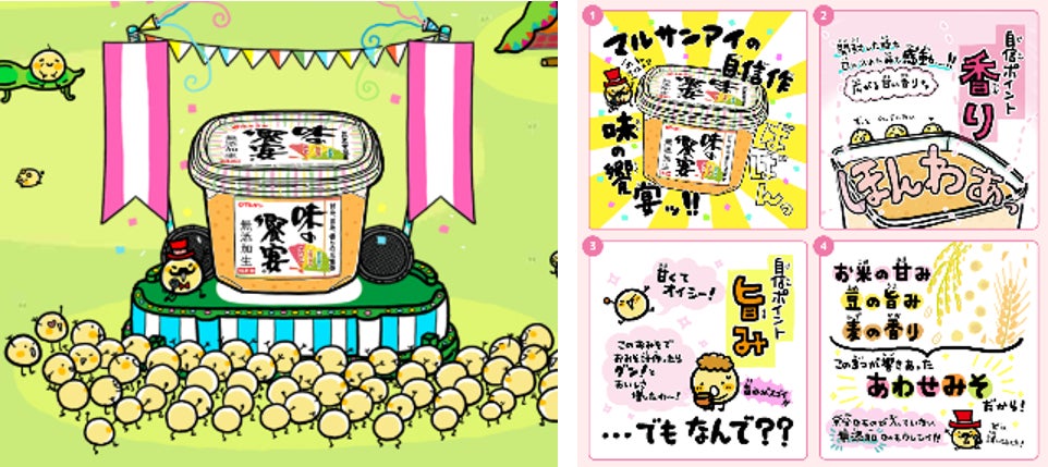 新商品、リニューアル商品を中心に、様々なマルサン商品をマンガでわかりやすくご紹介しています。第1回目は、今秋“白く、甘く”をキーワードにリニューアル、当社オリジナルの“三種麹元仕込み製法”でつくる「味の饗宴 無添加生 750g」を取り上げております。