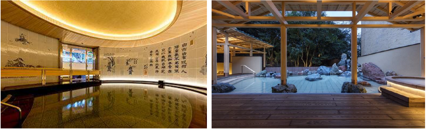 至高のラグジュアリーを求めるお客様が世界中から数多く訪れるホテル川久において、欠かせないリラクゼーションスポットの一つとして高い人気を誇る「悠久の森」。内風呂と露天風呂のシンプルな構造ながら、内風呂の壁面には陶芸家の青山禮三氏の描く仙人画と、陶淵明の「山海経を詠んで」から抜粋された漢詩が描かれており、不老長寿の願いが込められた芸術が施されております。