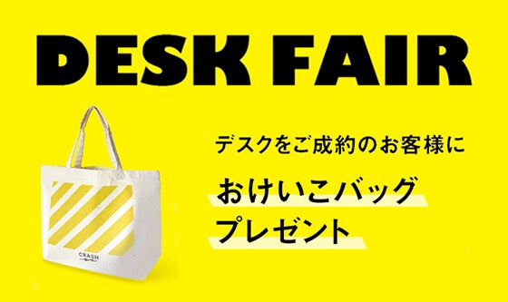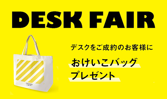 クラッシュの全国取扱店と直営店のクラッシュゲート、公式オンラインストアでは、ただいま「デスクフェア」を開催中です。期間中にクラッシュのデスクどれでもご購入いただいたお客様に「おけいこバッグ」1個をプレゼントいたします。