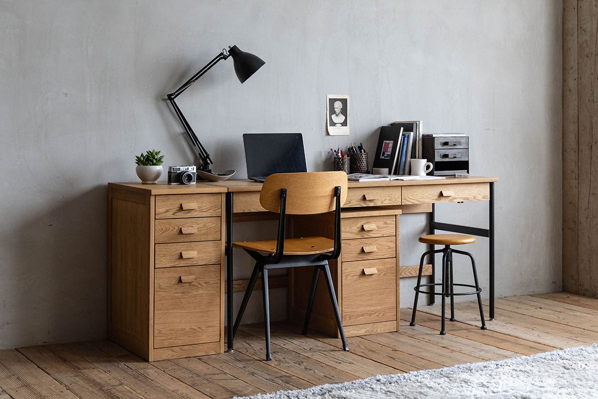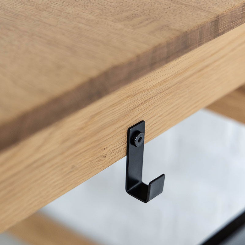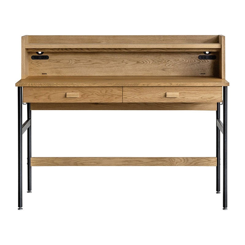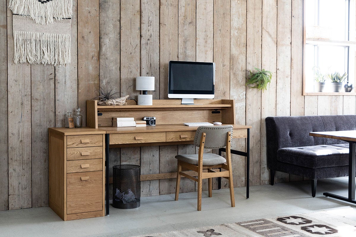 ガクトデスクはオーク材を贅沢に使い、オイル仕上げを施してその美しい木目と豊かな風合いを活かしたデスクです。風合い豊かな天然木に異素材のブラックスチールを組み合わせることで空間を引き締め、温かみがありながらもスタイリッシュな雰囲気に仕上げています。