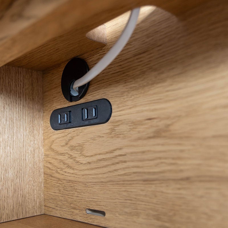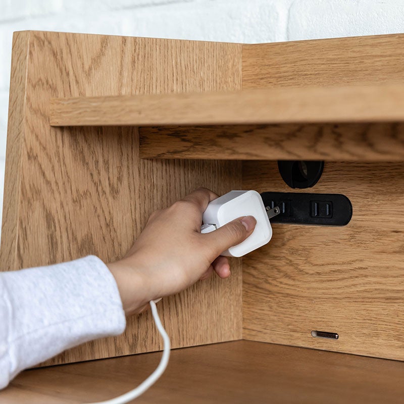 上置きにはコンセントが2口ずつ左右両サイドに付いています。デスクライトやモニター、パソコンの電源として、またはスマートフォンやタブレットの充電にもお使いいただけます。