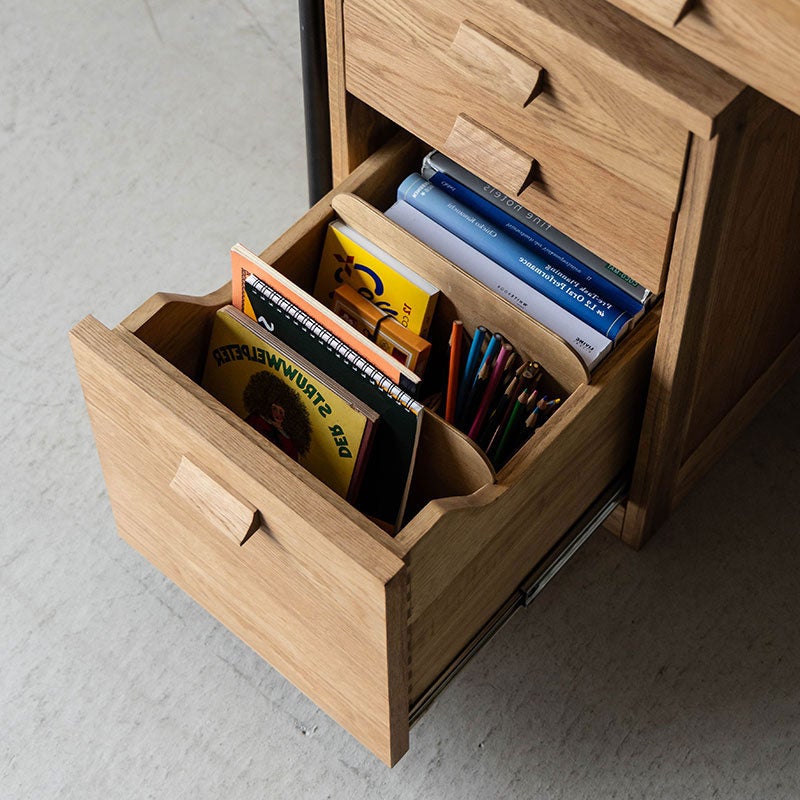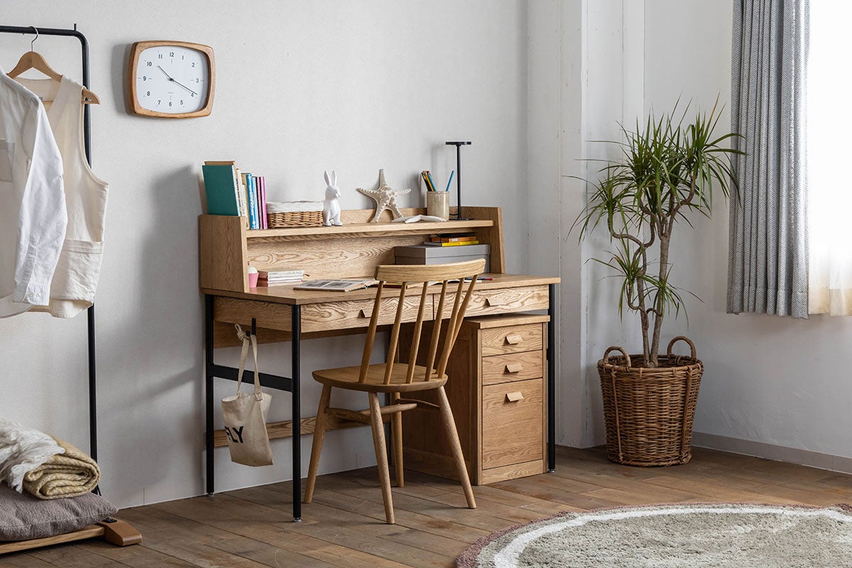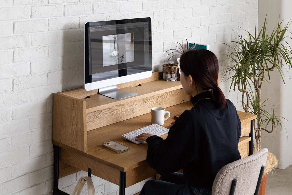 コンパクトながら収納力もある、バランスの取れたスタンダードなレイアウトです。お子様の学習デスクとしてお使いいただけるのはもちろん、大人も仕事用デスクとしてお使いいただけます。上置きはモニターを設置するのにちょうど良い高さに設計しているため、パソコンデスクにもおすすめです。