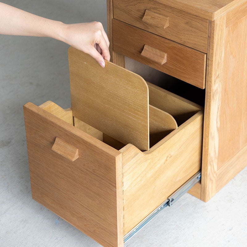 ワゴンの最下段引出しは、仕切り板がついているので引出しの中を整理できます。仕切り板は取り外しできる仕様で大きさや収納量に合わせて、つけたり外したりしてお使いいただけます。また、最下段引出しは深さがあるため、高さがある物やかさばる物、例えば、絵具や習字といった学校の道具類の収納にも便利です。