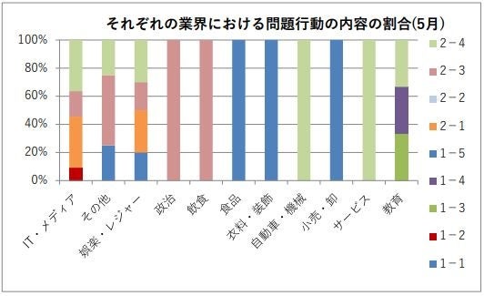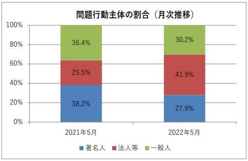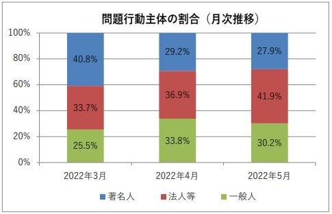 炎上事案の原因となった問題行動の主体別の内訳では、「著名人」24件(27.9%)、「法人等」36件(41.9%)、「一般人」26件(30.2%)という結果でした。5月は法人等の炎上事案発生率が多く割合を占めております。