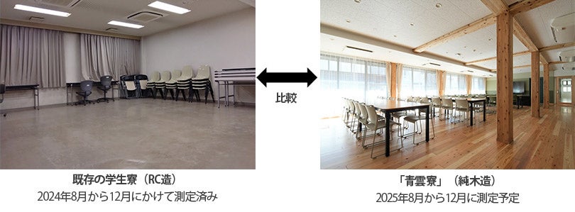 今回は東京農業大学の協力のもと、8月から12月にかけて「青雲寮」で床の硬さ、光、温湿度、香りや寮生の心理的・生理的な状態を測定します※4。既存のRC造の学生寮と比較して「木」が心身の健康、競技パフォーマンスなどに与える効果を検証し、結果は2026年に発表予定です。非木造建築(RC造・鉄骨造)を木造に変える効果を定性的・定量的に立証し、快適な空間づくりと木造建築の価値向上につなげる狙いです。
