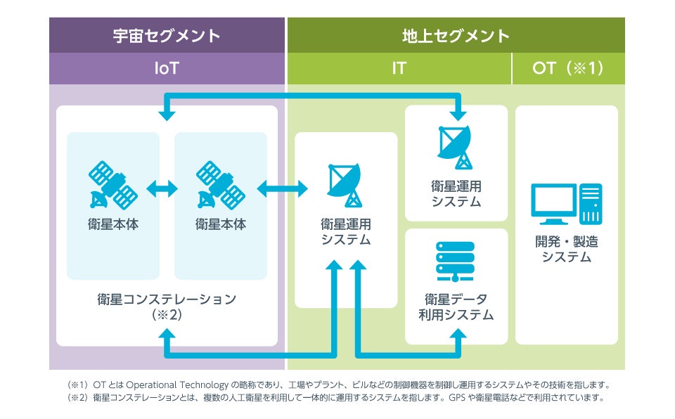 [iv] 地上セグメント:宇宙セグメント内のIoTデバイスを制御する衛星観測システムなどのITシステム、または衛星通信モデム等のIoTデバイスから構成される分類を指します。