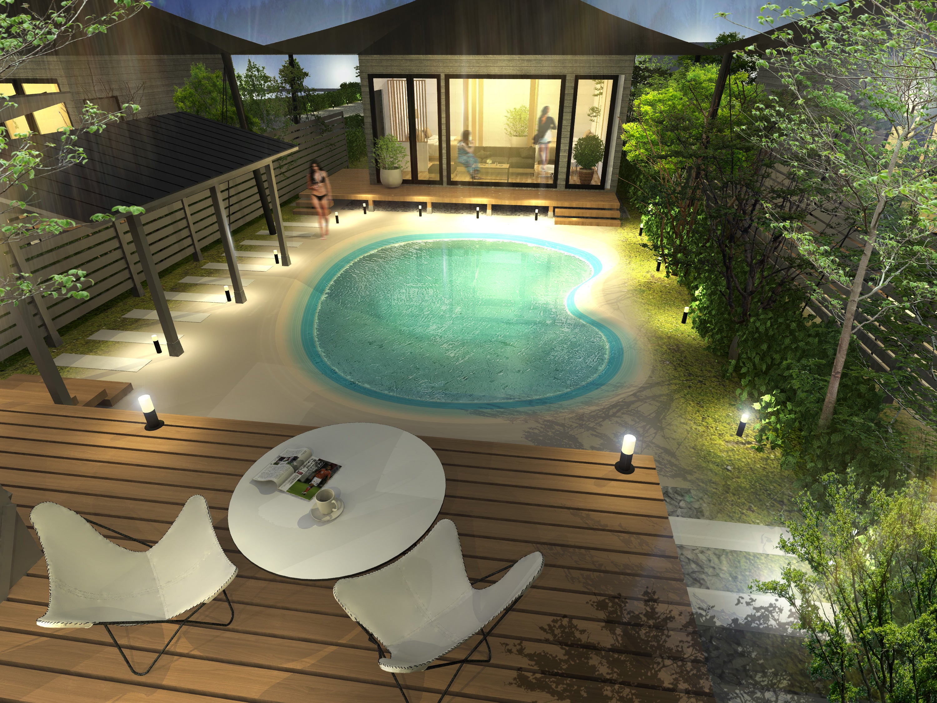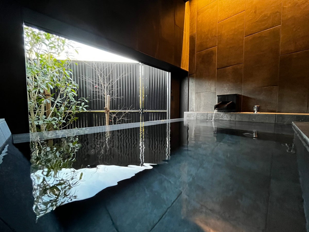 敷地内に湧き出る源泉を使用した客室温泉、サウナ、プライベートプールを配した非日常空間。