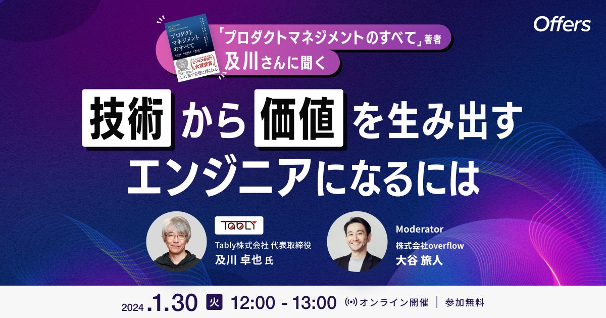 1/30(火)12:00~「プロダクトマネジメントのすべて著者 及川さんに聞く 技術から価値を生み出すエンジニアになるには」を開催