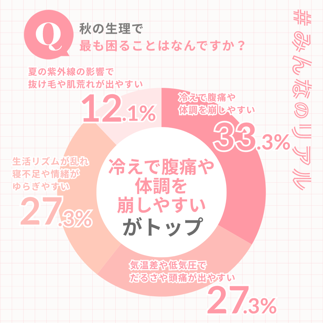 秋の生理で困る症状は、体の冷えや気温の変化による体調不良が中心であることがわかりました。特に働く女性にとって、冷えやだるさ、頭痛といった症状は仕事中の集中力やパフォーマンスに影響することも少なくなく、日常生活にも制限を感じるケースがあります。また、生活リズムの乱れや情緒のゆらぎも重なることで、心身ともに負担を感じやすい時期であることがうかがえます。季節ごとの体調変化に合わせたセルフケアや職場での理解・配慮の重要性が改めてわかります。