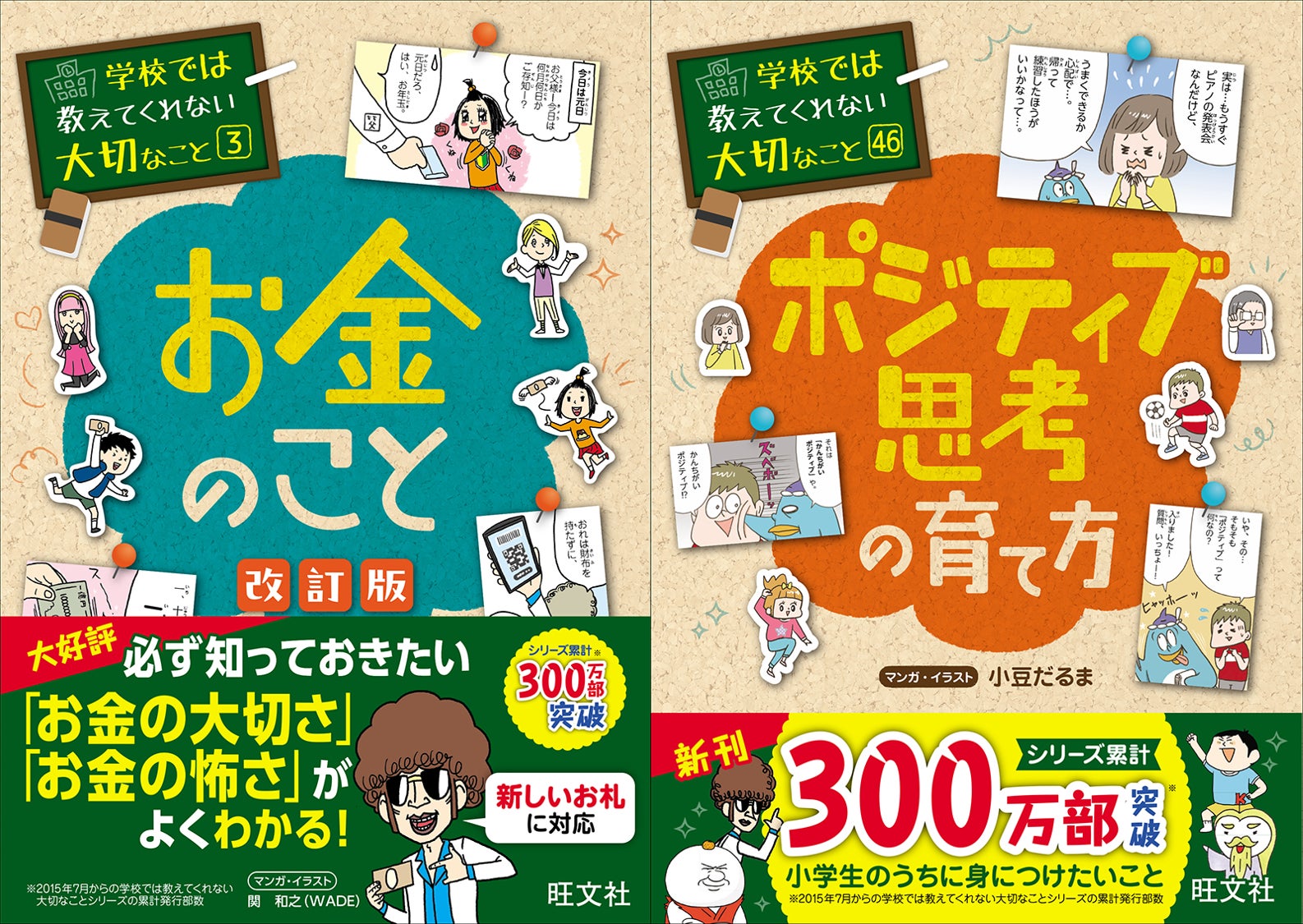 教育出版の株式会社旺文社(東京都新宿区、代表取締役社長 粂川秀樹)は、「学校では教えてくれない大切なこと」シリーズの最新刊、『3 お金のこと 改訂版』、『46 ポジティブ思考の育て方』を3月8日(金)に刊行いたします。本シリーズは、学校で教える教科の枠を超え、将来にわたって役立つ力をマンガで身につけられる子ども向け実用書です。2015年7月の刊行以来、累計300万部を突破するロングセラー商品であり、様々なラインナップから子どもの興味・関心に合った1冊を選んでいただくことができます。