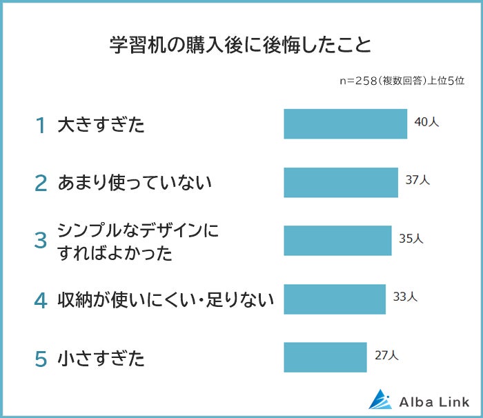 株式会社AlbaLink(本社:東京都江東区、代表取締役:河田 憲二)は、小学生以上のお子さんがいる親御さん258人を対象に「学習机の購入で後悔したことに関する意識調査」を実施し、そのデータをランキングにしました。