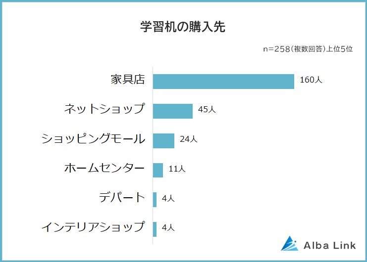 学習机の購入先でもっとも多かったのは「家具店(160人)」でした。地元の家具店や家具職人のお店で購入した人もいましたが、全体では大型家具店やチェーン店を挙げた人が多くなっています。