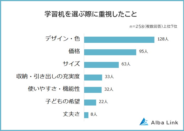 小学生以上のお子さんがいる親御さん258人に「学習机を選ぶ際に重視したこと」を聞いたところ、1位は「デザイン・色(128人)」でした。2位「価格(95人)」、3位「サイズ(63人)」が続きます。