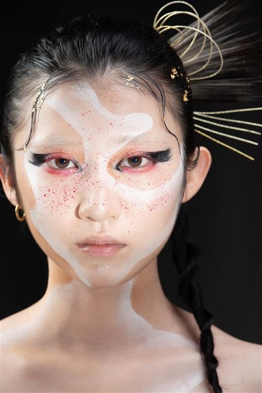 3人1組でヘア、メイク、モデルに分かれて作品作りを進めていましたが、次第に役割関係なくみんなで意見を出し合い、優秀賞という結果を残すことができたのは大切な思い出になりました。メイクは、白のグラデーションと赤のコントラストがわかるように細部までこだわって、目尻には鶴影と羽をイメージしました。ヘアは、直線と曲線のバランスを意識して形作りしたのがポイントです。美容師兼ヘアメイクアップアーティストになって、お客様に自信と幸せを与えるという夢に向かってこれからも励んでいきたいと思います。
