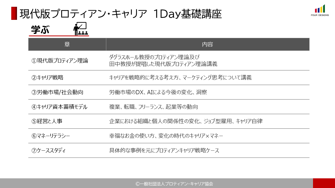 この現代版プロティアン・キャリア理論をベースにした認定資格を1日の基礎講座と検定で取得できます。