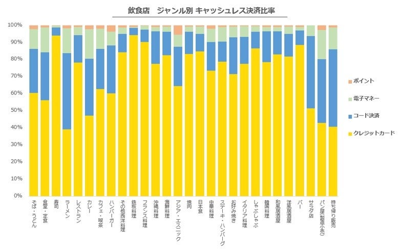 ジャンル別に見ると、寿司・その他西洋料理・鉄板料理・フランス料理・しゃぶしゃぶでキャッシュレス比率が60%を超える。キャッシュレス比率が27.6%と一番低いラーメンでも、コード決済が10%を超える。