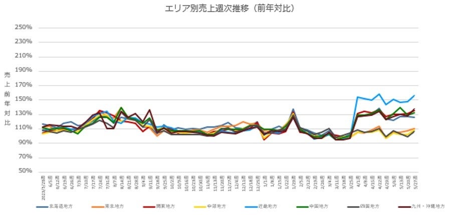 各地域の売り上げについては、近畿地方で前年対比150%を上回る。