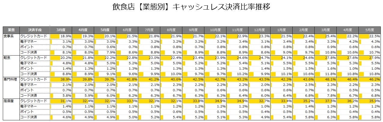 ・キャッシュレス決済手段別では、4月度から5月度で比較すると、専門料理と居酒屋のクレジットカードの割合を