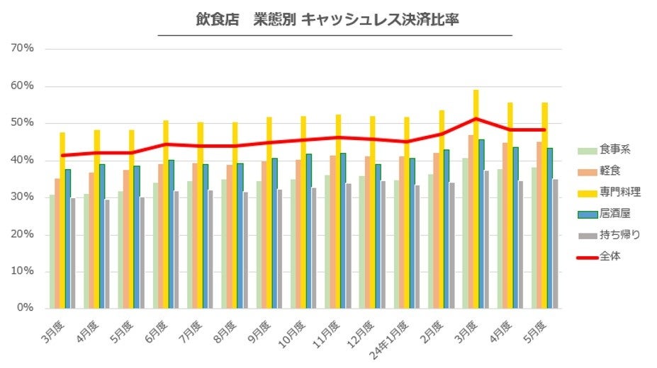 業態別で見ると、キャッシュレス決済利用は、1位の専門料理が49.9%で前月より0.2pt減少した。