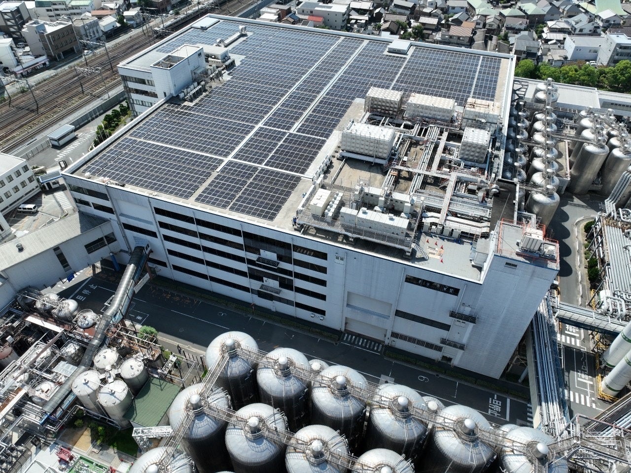 吹田工場内にある製造施設屋上に太陽光パネルを2,410枚設置します。総パネル設置範囲面積は11,166平方メートル、発電見込み量は1,638MWh/年、発電設備パネル容量は約1,315kWです。これまで吹田工場では、電力会社を通じて再生可能エネルギー発電所などで発電された環境価値(トラッキング付非化石証書など)が付与された電力を購入していました。今回の設備導入により、吹田工場内の太陽光による発電見込み量は、これまで同工場が外部から調達していた再エネ電力の約16%に相当します。