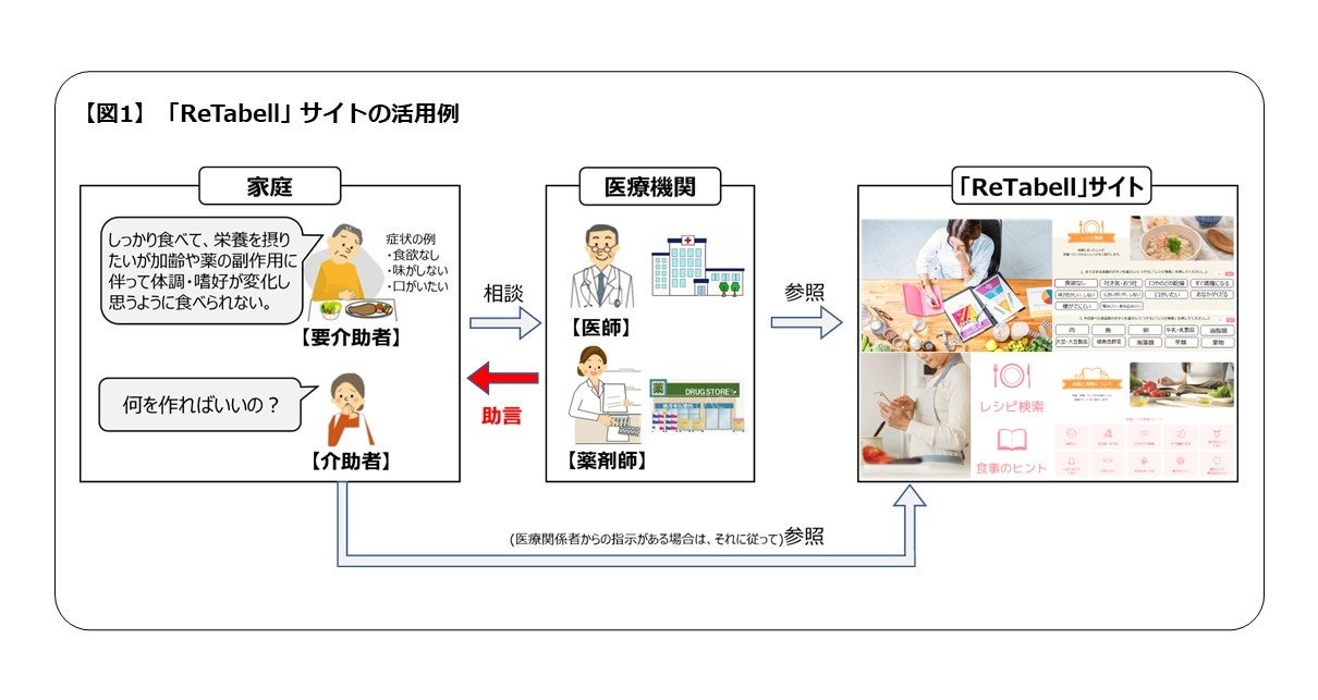 「ReTabell」サイトは、要介助者の”体調”・嗜好が変化して一旦食べられなくなっても再び(Re)食べられるようになることや、医療関係者(医師、薬剤師等)や介助者の要介助者に対する利他(リタ)的行動を支援するWebサイトです。
