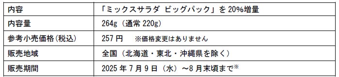 株式会社サラダクラブ(代表取締役社長:新谷昭人、本社:東京都調布市)は、2025年7月9日(水)から8月末の期間限定で、「ミックスサラダ ビッグパック」を20%増量して全国(北海道・東北・沖縄県を除く)で販売します。