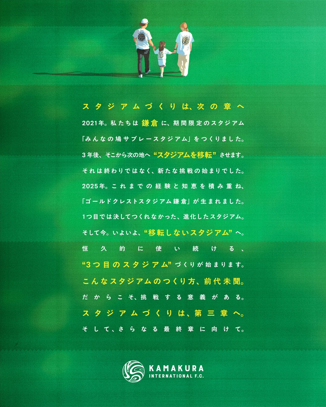 改めて、「スタジアム」に対する決意表明の意を込め、私たちがこれまで多くの方々と力を合わせて挑戦してきた「スタジアムづくり」の軌跡を記すとともに、3つ目のスタジアム建設に向けて始動することを宣言するものとなっています。