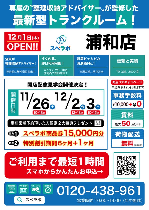 【12月1日(木)オープン】見学から契約、解約まで完全非接触・非対面、お申し込みからご利用まで最短1時間!都内、大阪などにて絶賛運営中のトランクルーム【スペラボ】が埼玉県浦和駅近くに出店!