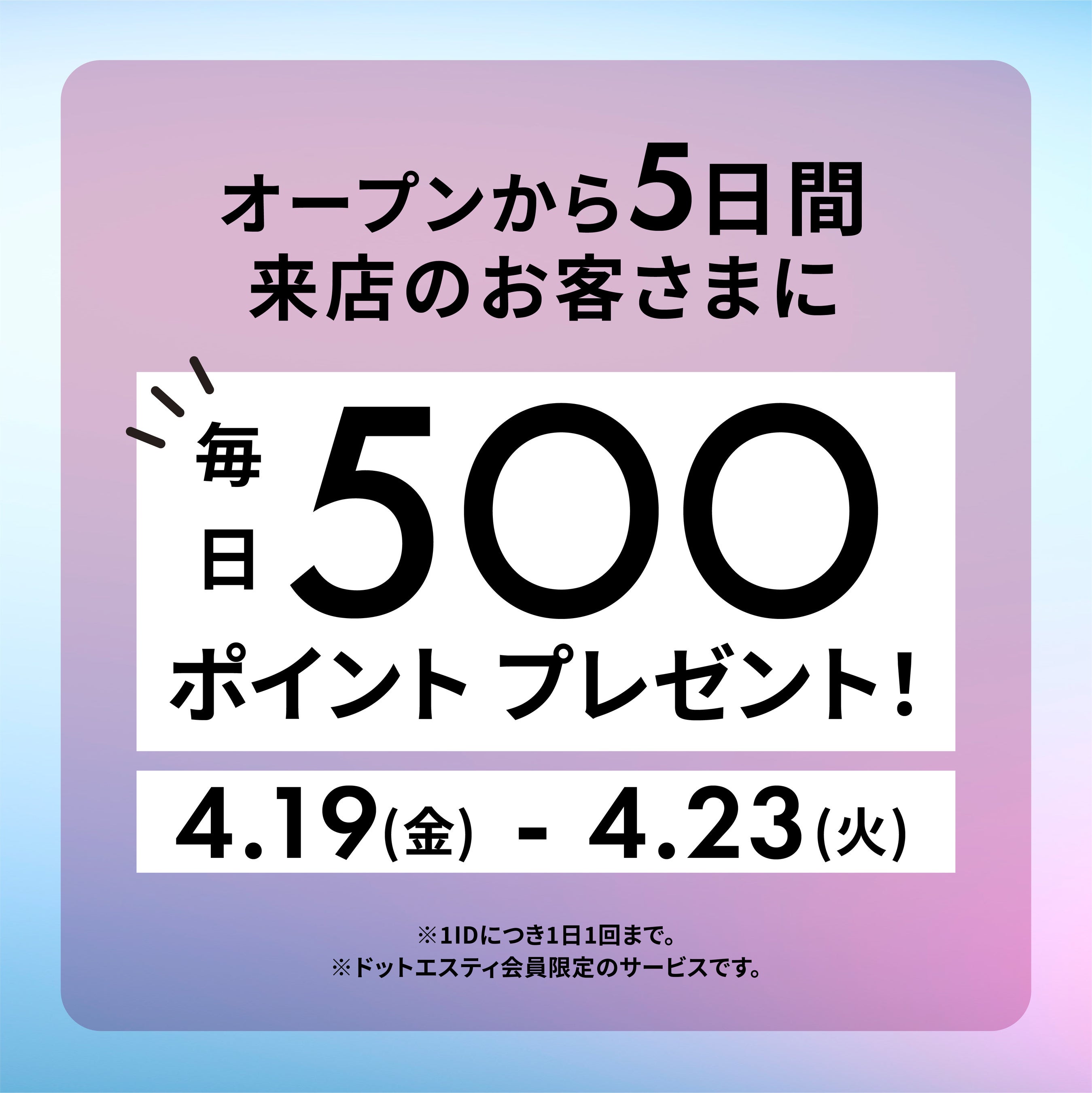 オープンから5日間、ご来店いただいたお客さまに毎日ドットエスティポイント500ポイントをプレゼントします。その他にも人気キャラクターのPOPUPも実施します。