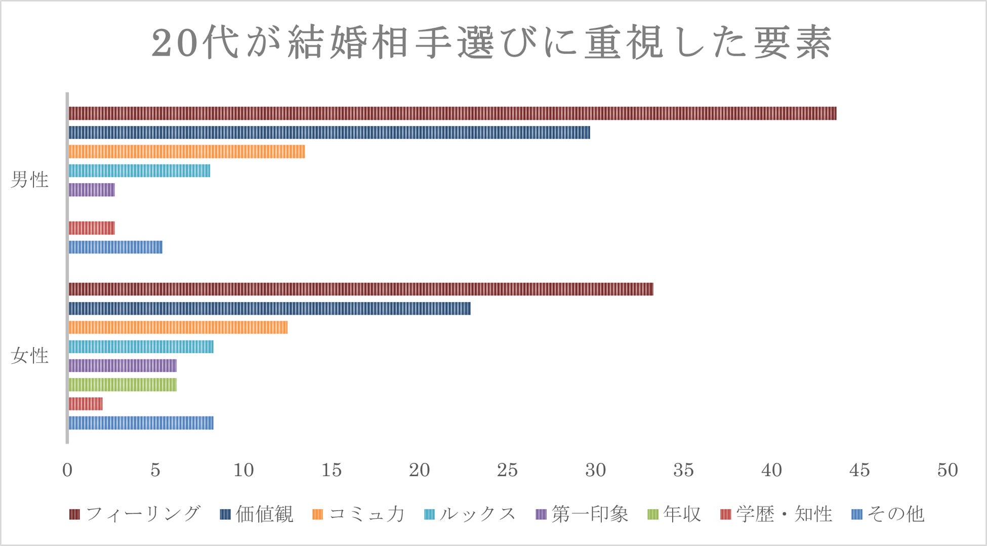 このように、『フィーリング』という一言には、20代が人生のパートナーに対して、収入やルックスといった表面的な要素よりも、自分らしさを大切にしながら相手と自然体でいられる関係性を求めている傾向が包括される結果となりました。