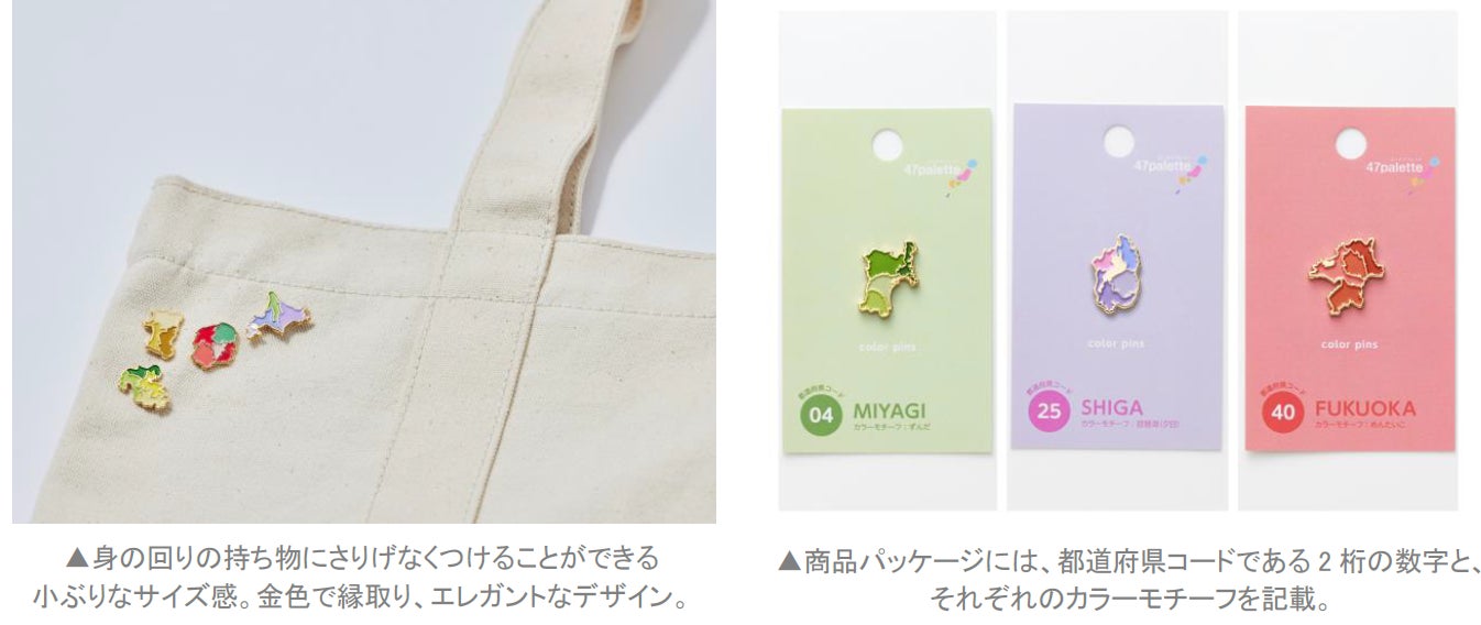 「街まち 47palette カラーピンズ」は、47都道府県それぞれの形を、宮城県は「ずんだ」、滋賀県は「琵琶湖の夕日」、福岡県は「めんたいこ」のように、名産品や名所などをイメージした色で彩り豊かに表現したピンバッジです。