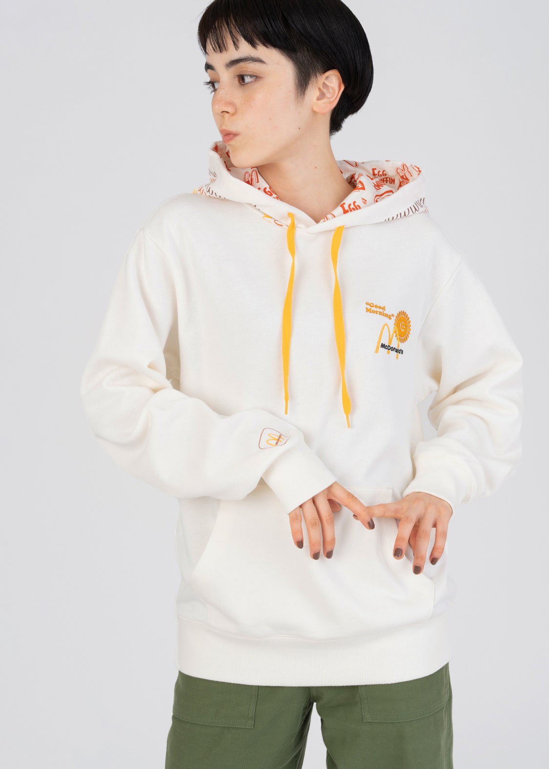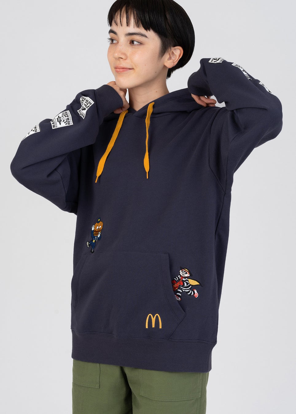 エッグマックマフィン®️のロゴや包み紙のパターン柄がおしゃれな1枚。1980年代後半に使用されたロゴ(右袖)と3色のゴールデンアーチ(フード)が並んだ懐かしいデザインにも注目です。
