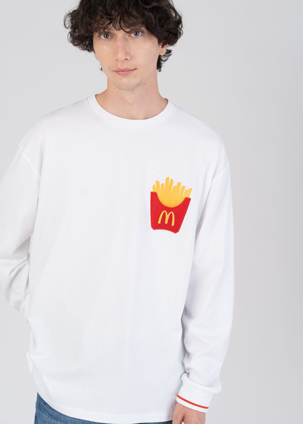 マックフライポテト®️のケース部分がポケットになった遊び心あるデザイン。中身のポテトは刺繍で表現されています。風合いの良い天竺を使用した、袖口がリブタイプの長袖Tシャツ。