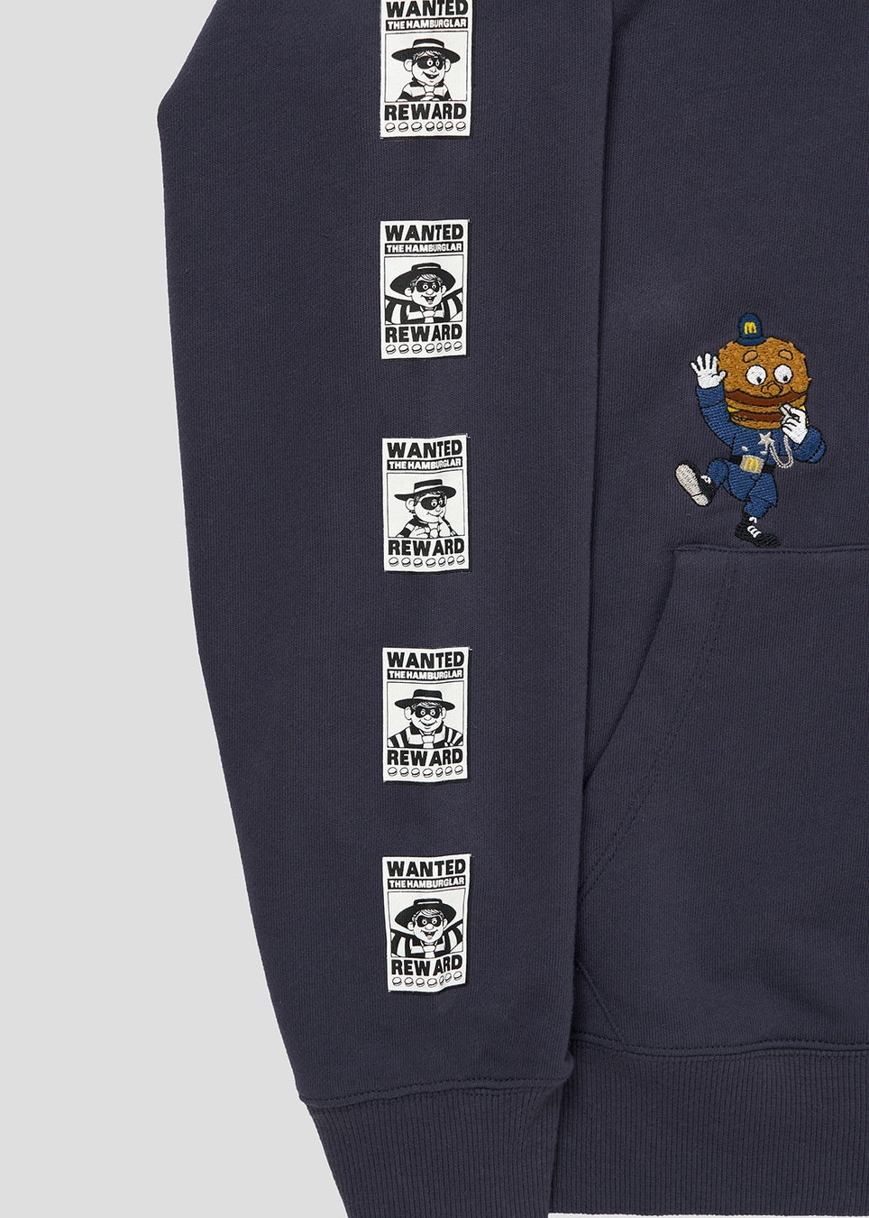 ビッグマックポリスから逃げてポケットに隠れようとしているハンバーグラーの逃走劇をイメージしたデザイン。両袖にはハンバーグラーの手配書が並んでいます。捕まえることが出来たらハンバーガー7個がもらえちゃうかも?!
