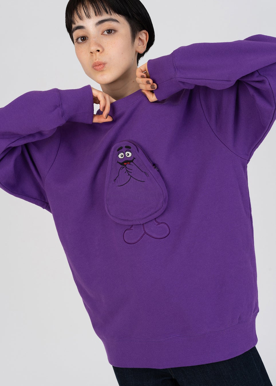 マックシェイク®️が大好きなキャラクター、グリマスが立体的なポケットになったユニークなデザイン。バックには手をあげて微笑むグリマスが刺繍されています。風合いの良い裏毛を使用したベーシック型のスウェット。