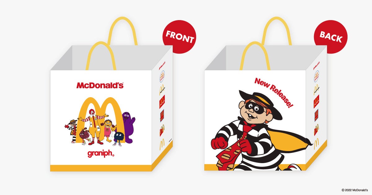 また、本コラボレーションの発売を記念して限定ステッカー、限定紙袋のノベルティキャンペーンを開催。さらにグラニフ9店舗にて、マクドナルドランドの住人たちが勢揃いしたショップ イン コーナー「McDonaldland」を2022年11月1日(火)から11月13日(日)まで、期間限定で展開いたします。キャラクターパネルが展示され、フォトスポットとしてお楽しみいただけます。