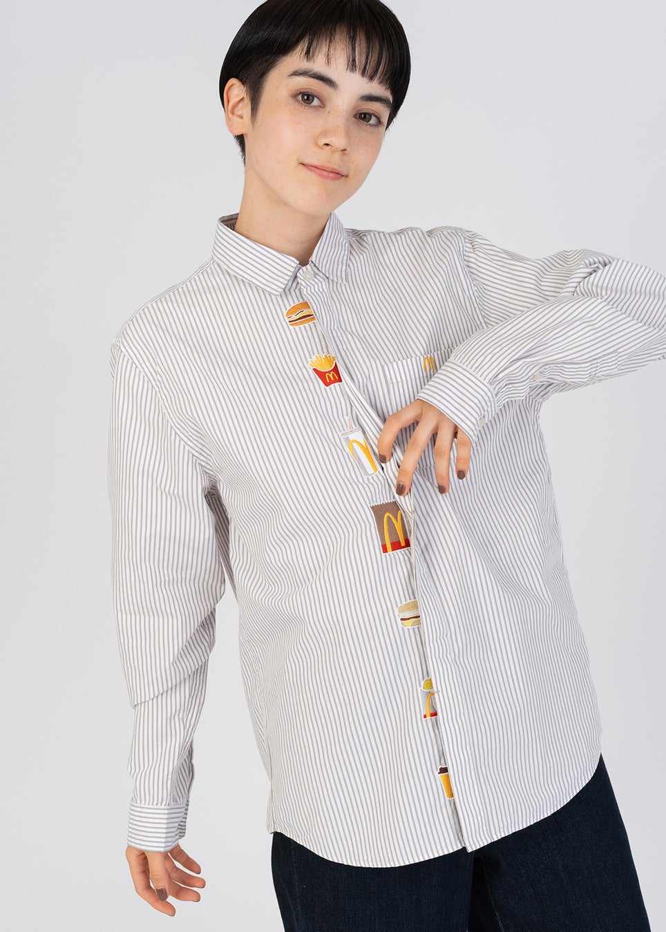 様々なメニューが比翼下に刺繍されたデザイン。上からチーズバーガー、マックフライポテト®️、ドリンクカップ、紙袋、ソーセージエッグマフィン、ハッシュポテト、コーヒーカップです。