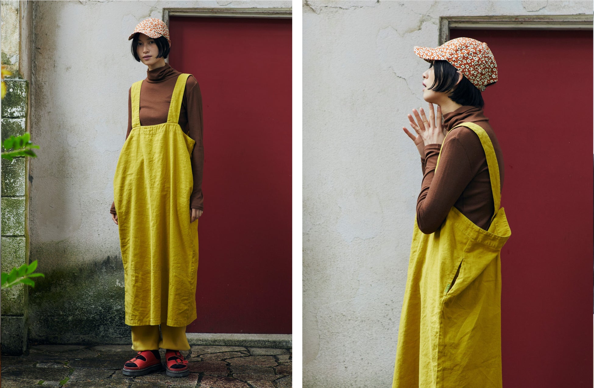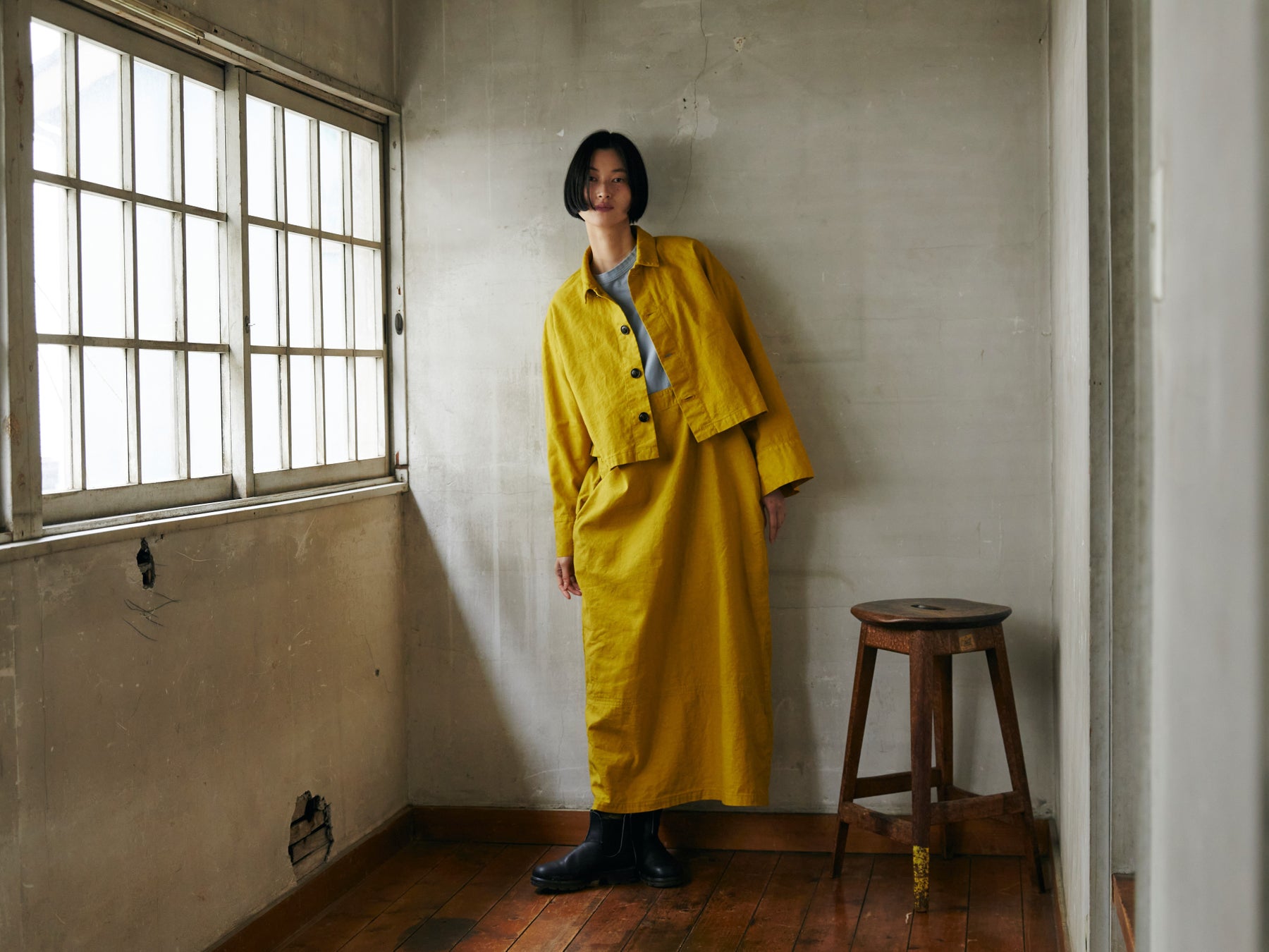 爽やかな【 LEMON YELLOW 】、鮮やかな【 ROSE 】、上品な【 INK BLACK 】の3色。シャツジャケットと、ジャンパースカートの2型をご用意致しました。