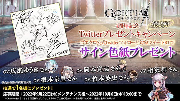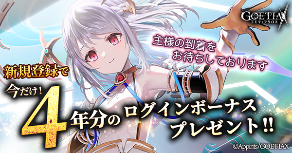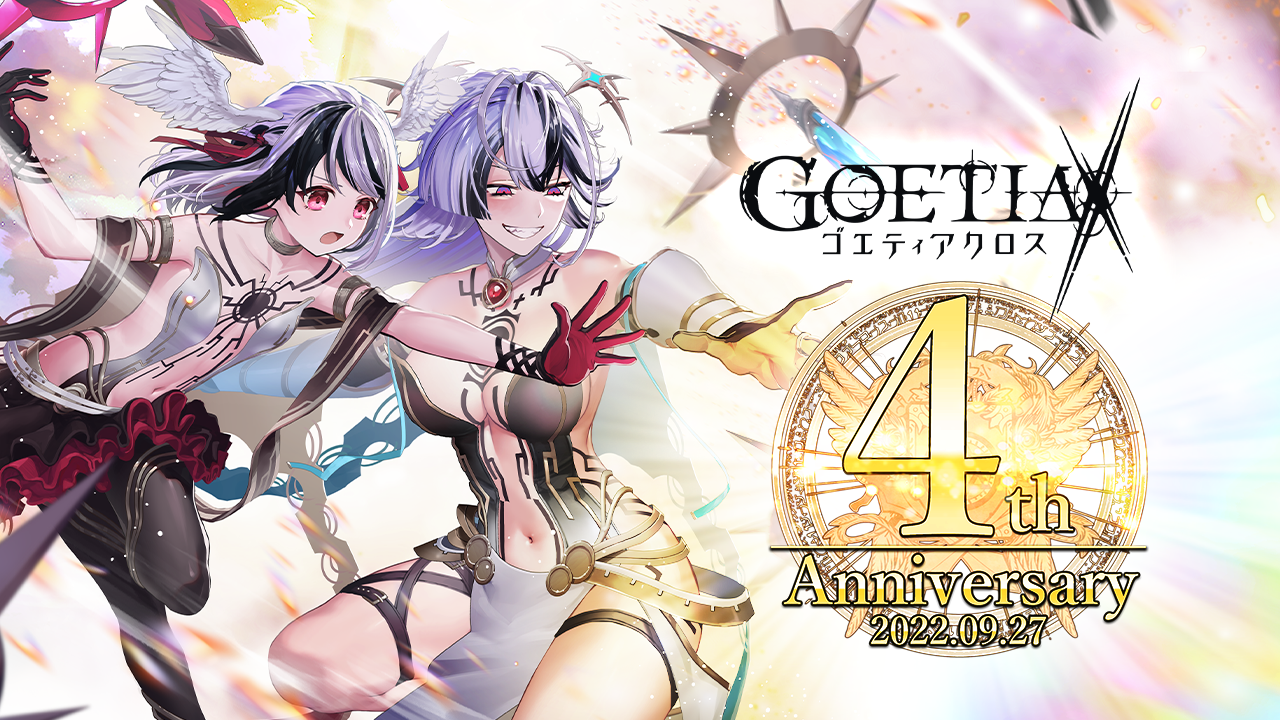 株式会社アピリッツ(本社:東京都渋谷区、代表取締役社長執行役員CEO:和田 順児)が開発・運営するスマートフォンアプリ・ブラウザゲーム・PlayStation®4/PlayStation®5版『ゴエティアクロス』は、2022年9月27日(火)にサービス開始4周年を迎えました。『ゴエティアクロス』を愛してくださるユーザーの皆様に支えていただき、ここまで駆け抜けてこられました。心より感謝申し上げます。
