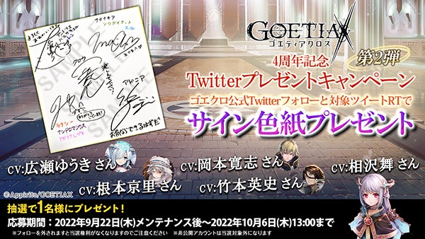 第2弾では、「レン」役の広瀬ゆうきさん、「エル」役の相沢舞さん、「ラナシー」役の根本京里さん、「クロウ」役の岡本寛志さん、「アドニア」役の竹本英史さんの直筆サイン色紙を抽選でプレゼントいたします。