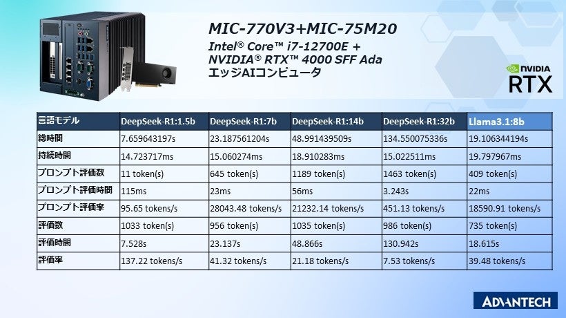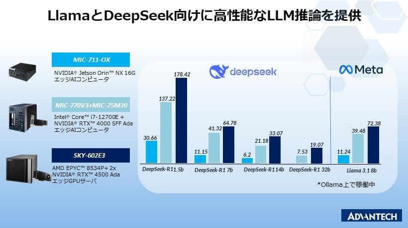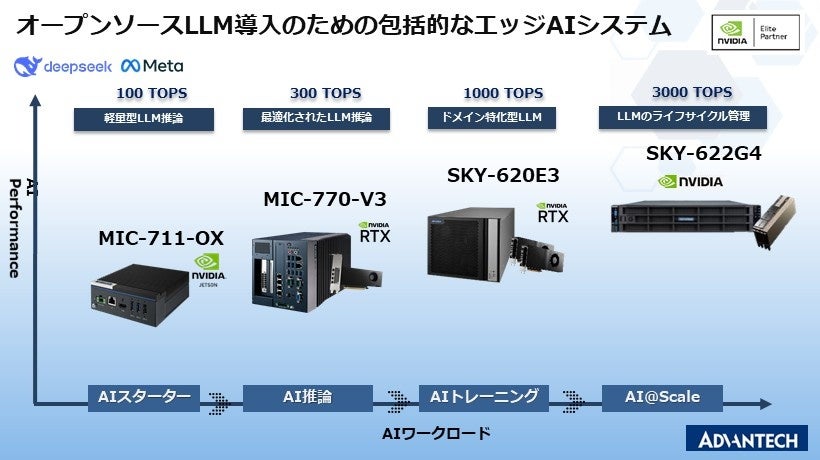 2025年3月19日 - Advantech Co., Ltd (台湾、TWSE: 2395、以下 アドバンテック)は、最新のNVIDIA®エッジAIコンピュータプラットフォームを活用し、オープンソースの大規模言語モデル(LLM)の導入に新たな進化をもたらします。DeepSeekやLlamaなどのオープンLLMに対応し、NVIDIA®のフルスタックコンピューティングプラットフォームやTensorRT-LLMの最適化、Jetson™プラットフォームを用いて、エッジで高速かつ迅速なAI推論を実現しています。