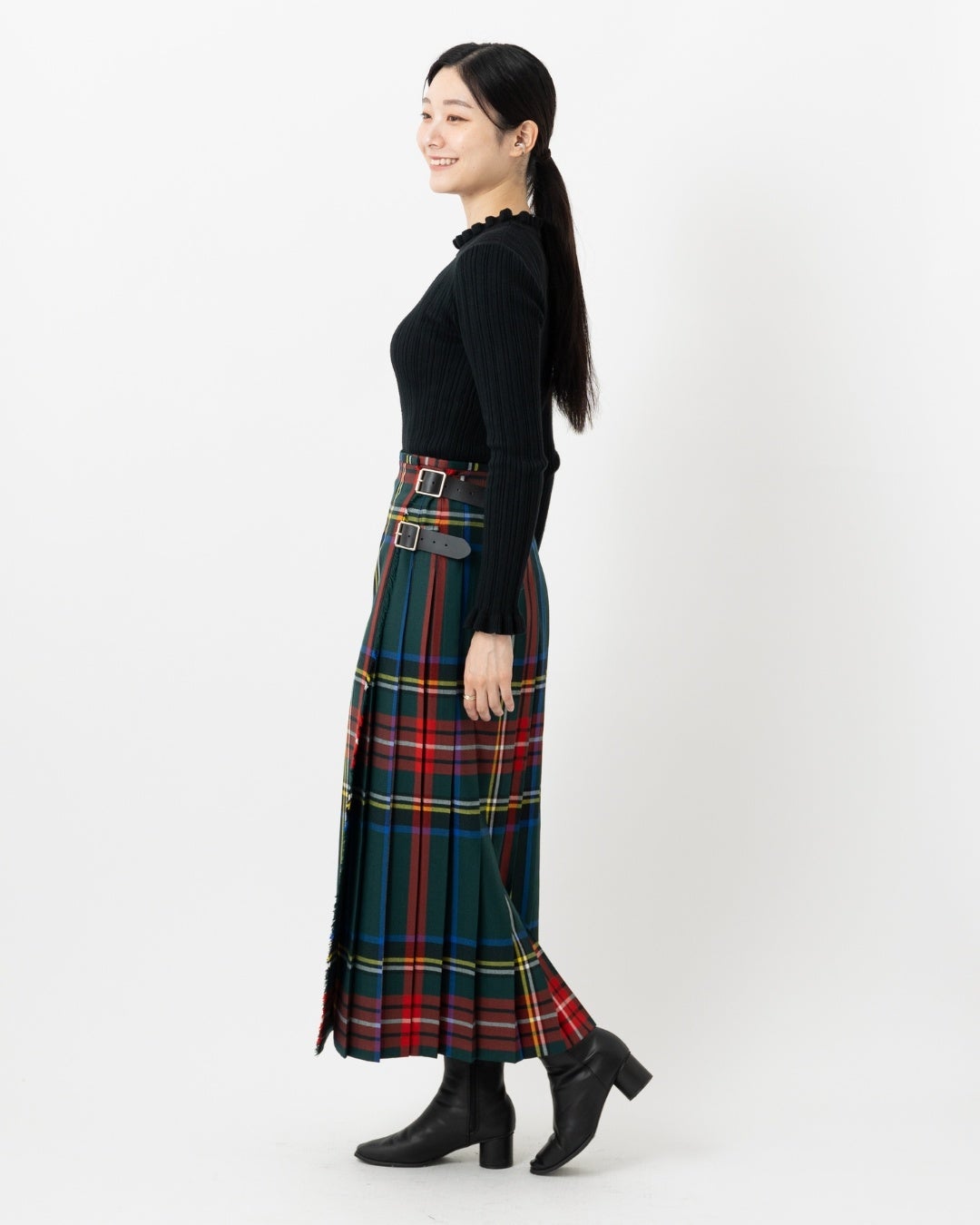 ベルトで留めて着る、時代に左右されない、クラシカルなキルトスカートをメインに展開。