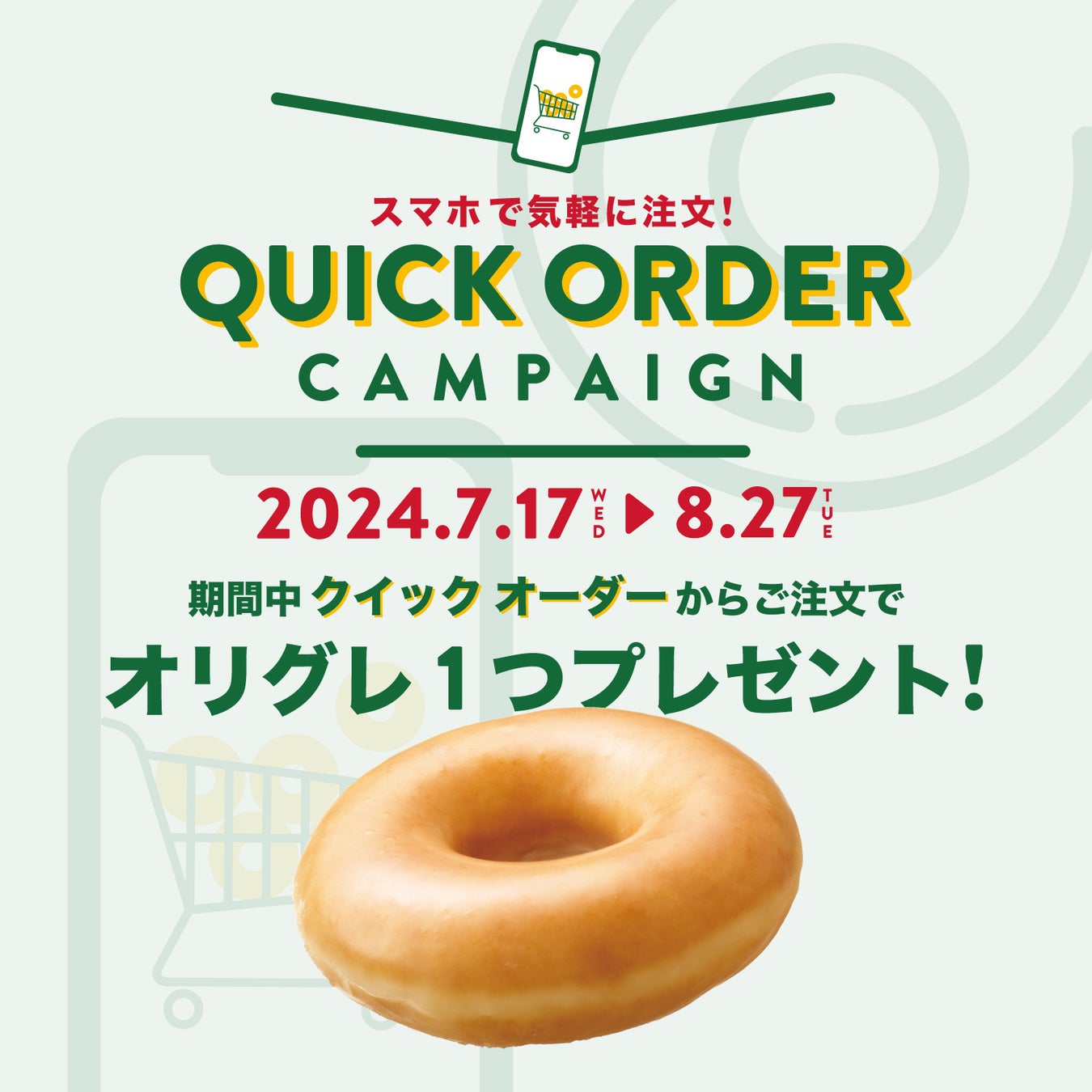 ■『クイック オーダー』キャンペーン 『クイック オーダー』から、2024年7月17日(水)~8月27日(火)の期間にドーナツ受け取りをご注文されたお客様全員に、オリジナル・グレーズド®を1個プレゼントします。期間中は何度でも、キャンペーンのご利用が可能です。 ※リユーザブルバッグやキャンドルなど、ドーナツ以外の商品のみのご注文はプレゼント対象外です。 ※店頭受け取りとデリバリーで価格が異なります。 ※デリバリーの場合、配送手数料が条件によって異なります。予めご了承ください。 |