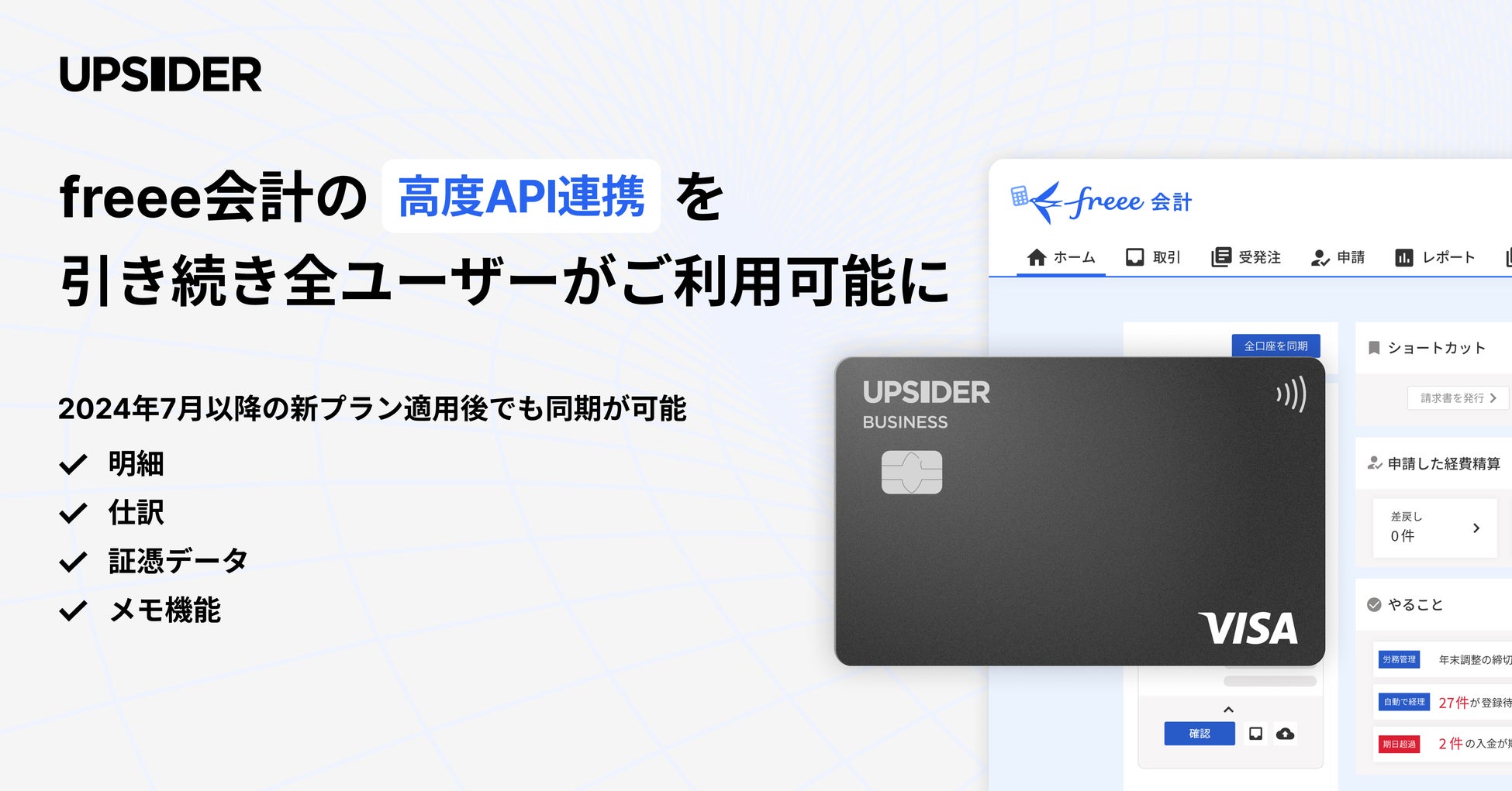 株式会社UPSIDER(代表取締役:宮城徹・水野智規、本社:東京都港区、以下 当社)は、フリー株式会社(本社:東京都品川区、CEO:佐々木大輔、以下freee)が提供する「freee会計」の高度API連携機能を、当社が提供する法人カード「UPSIDER」(以下、UPSIDER)の全ユーザーが引き続き利用可能となりましたので、お知らせいたします。