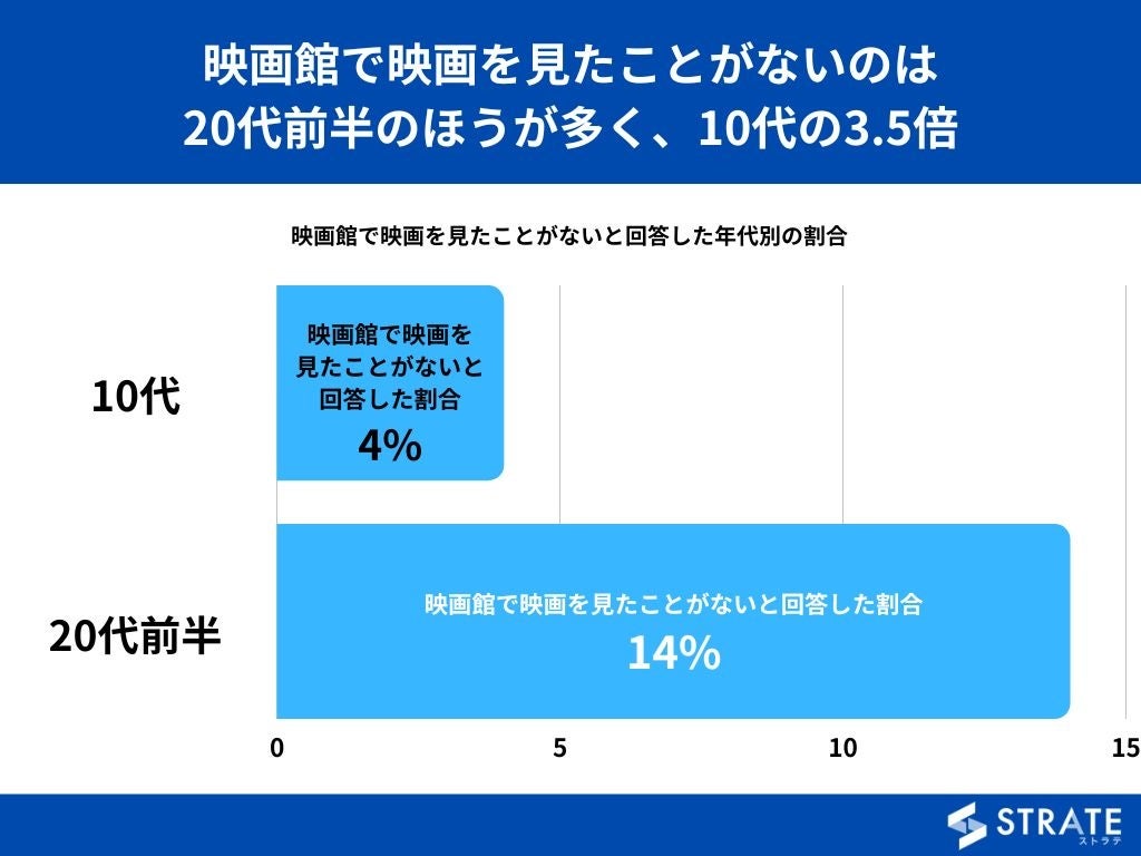 映画館で映画を見たことがないと回答した割合を年代別でみてみますと、20代前半が14%、10代が4%という結果になりました。