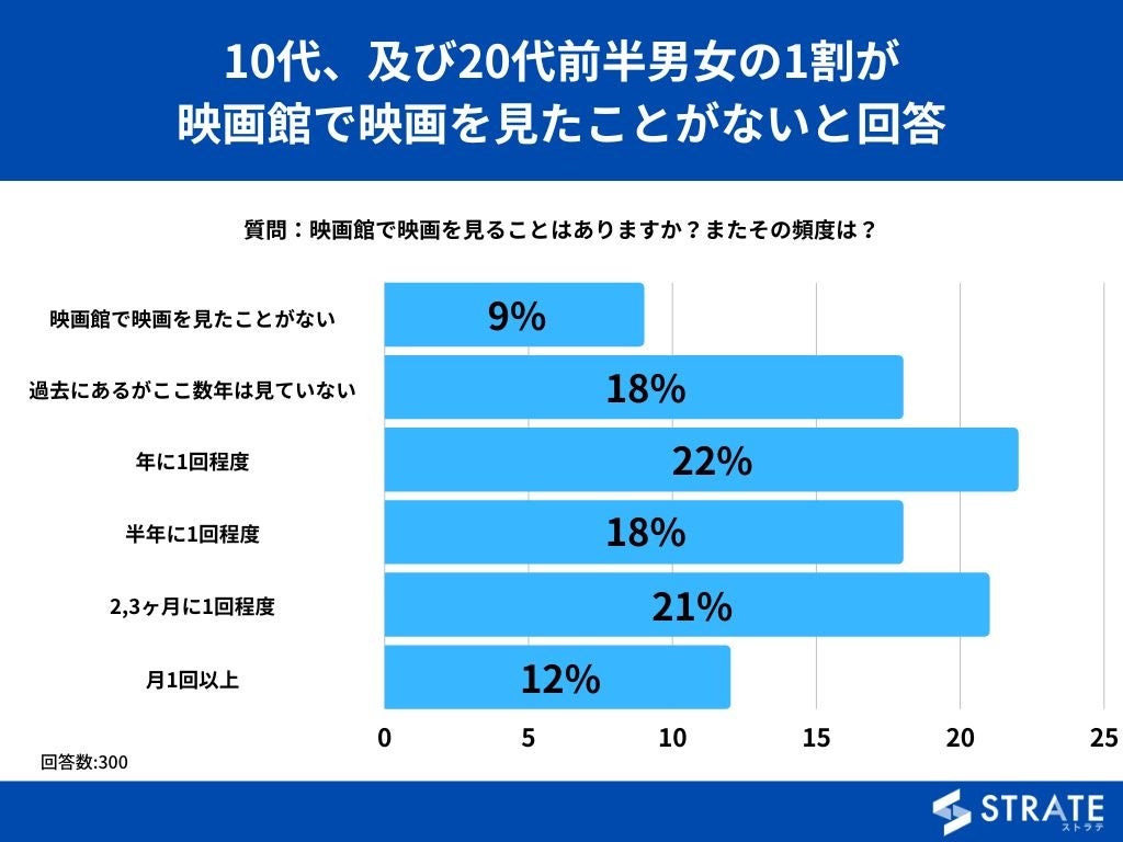 10代~20代前半の男女を対象とした「映画館で映画を見ることはありますか?またその頻度は?」というアンケートで最も多かった回答は「年に1回程度」で22%でした。