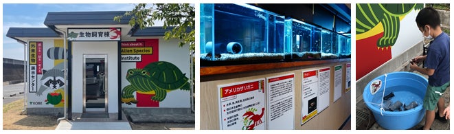 〇生物飼育棟ブラックバスなどの外来生物や、すみかを追われたメダカなどの生きた個体の展示からアメリカザリガニなどを触れることができ、間近に外来生物を感じることが出来る。