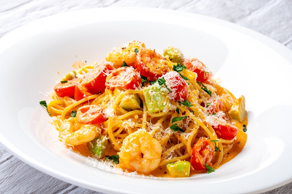 【メニュー名】【温製】海老と「純あま」、アボカドのトマトクリーム