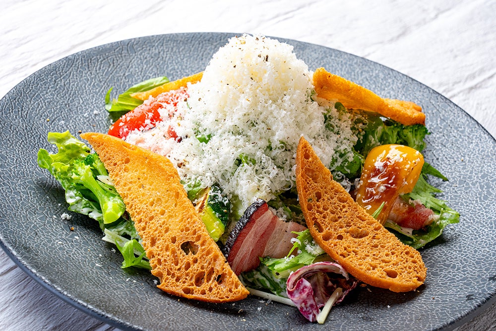 ゴロッと大きなベーコンと2色のパプリカ、ズッキーニなど全8種を使った彩り豊かなシーザーサラダ。