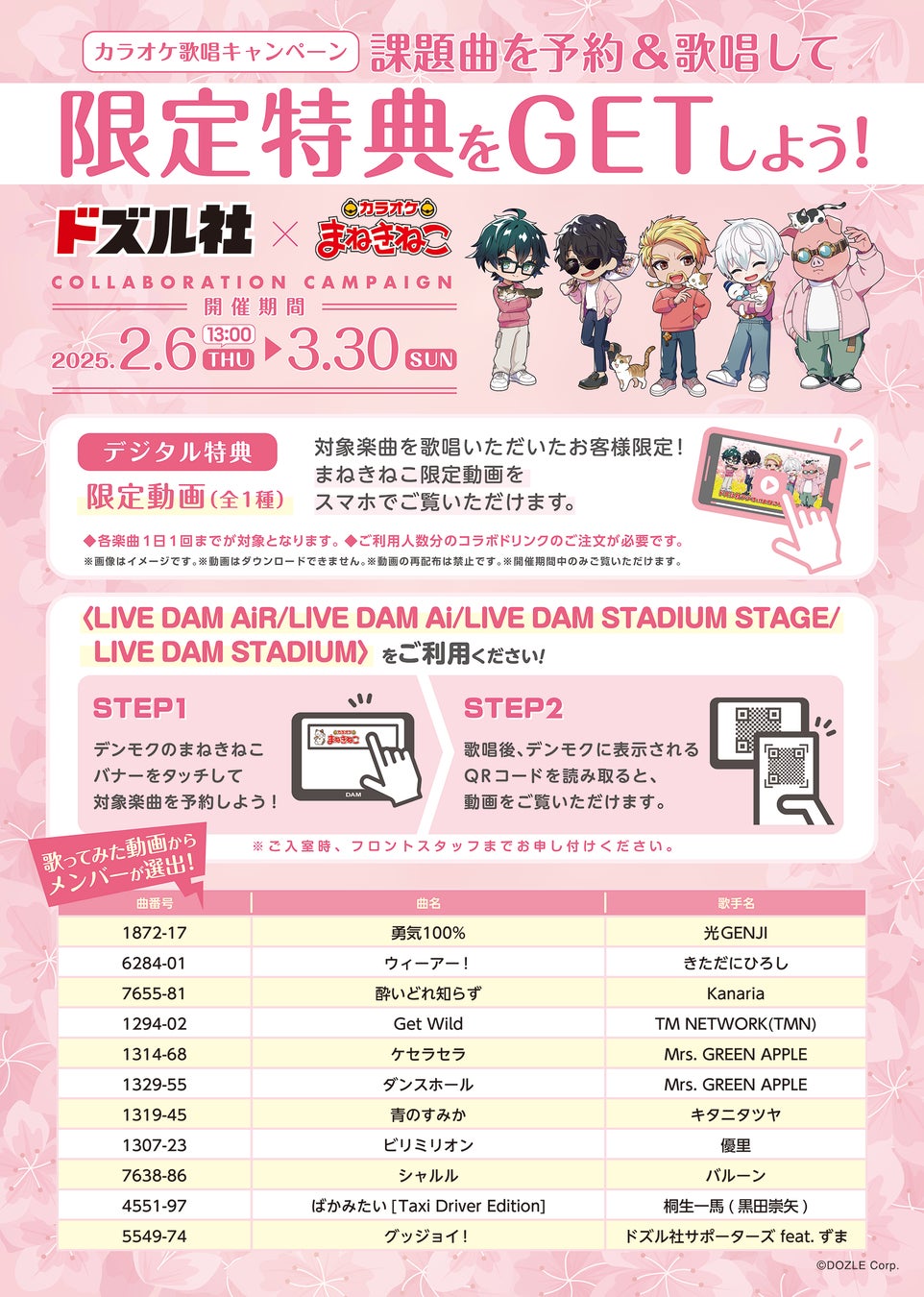 株式会社ドズル(以下、ドズル社 本社:東京都品川区、代表取締役社長:ドズル(YouTubeクリエイター))は、株式会社コシダカ(東京本社:東京都渋谷区、代表取締役社長:腰髙 博)が運営する全国カラオケチェーンで店舗数日本最大級の「カラオケまねきねこ」と、初のコラボレーションキャンペーンを2025年2月6日(木)より開催します。